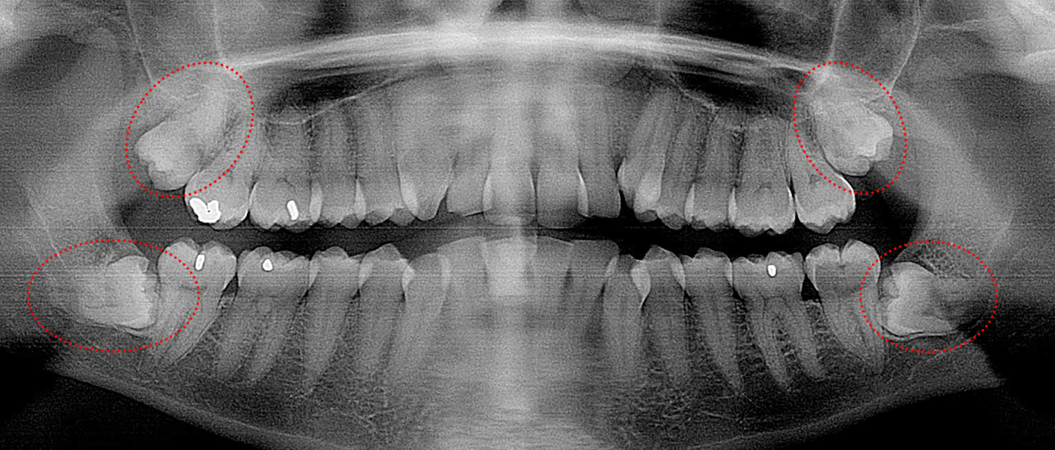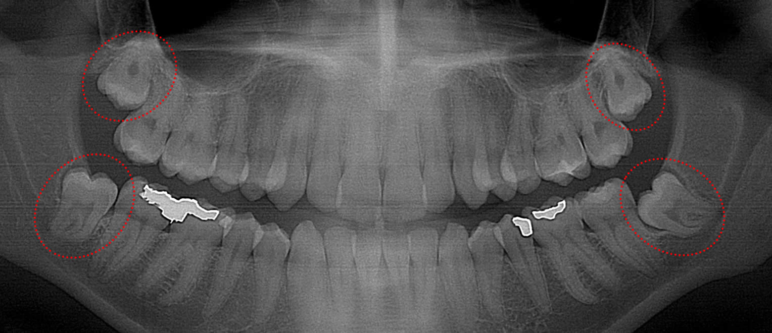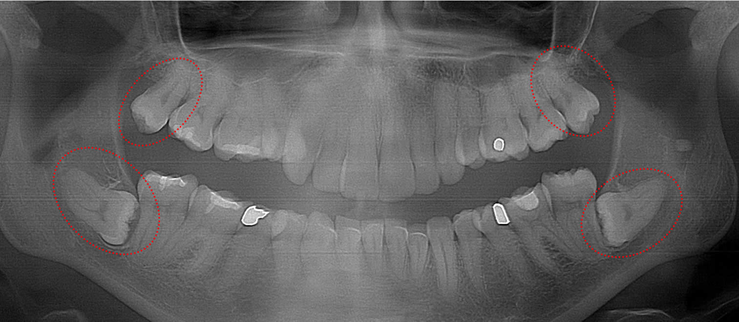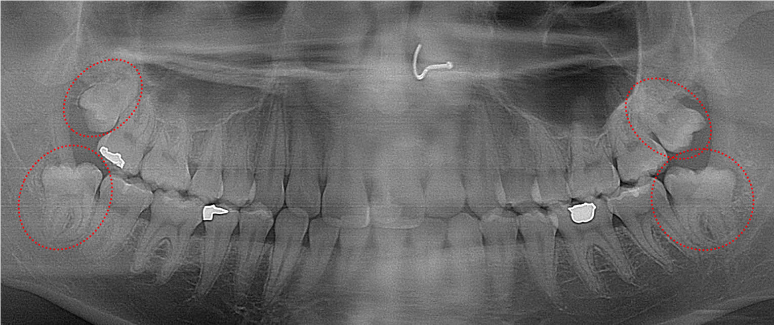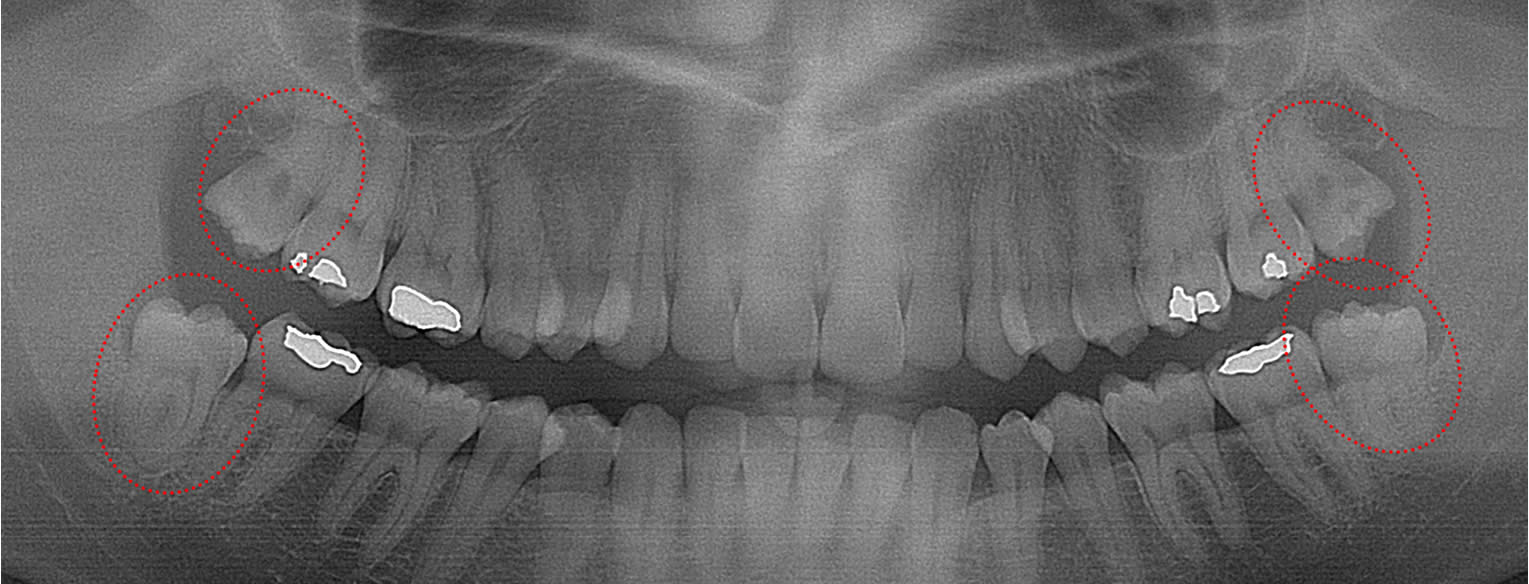 This 26 year old patient has all four 3rd molars present (circled). The upper right 3rd molar is badly decayed and the other three are partially erupted with signs of decay forming. Immediate extraction of all four is recommended.