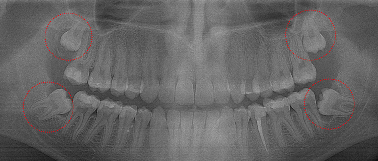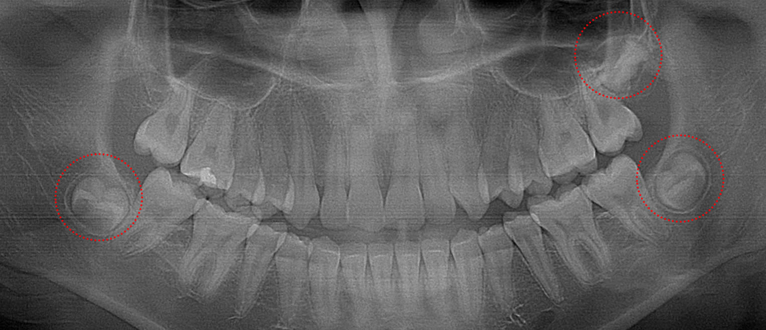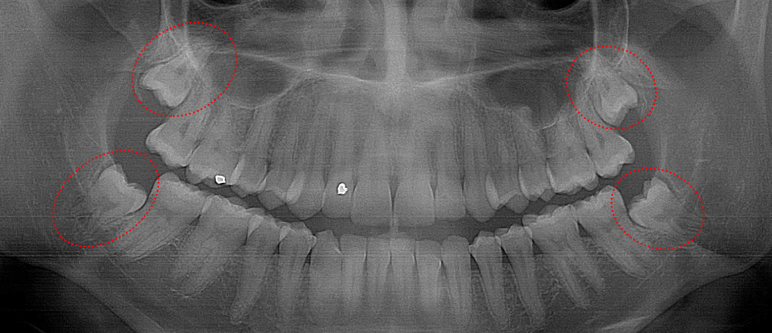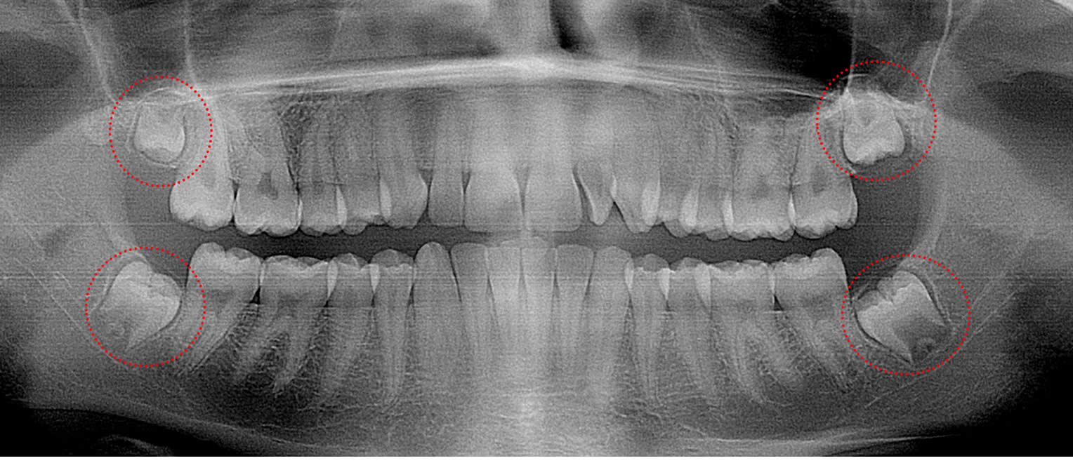 This 26 year old patient has all four 3rd molars present (circled). The upper right 3rd molar is badly decayed and the other three are partially erupted with signs of decay forming. Immediate extraction of all four is recommended.