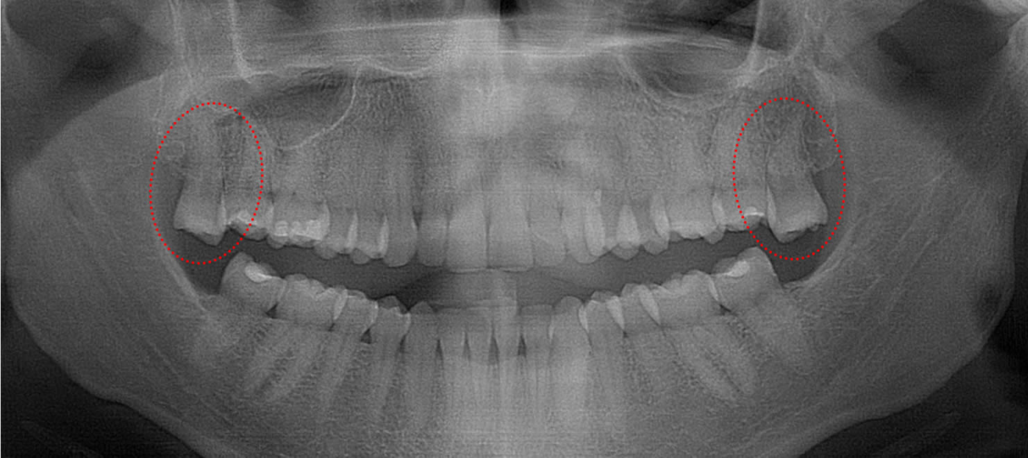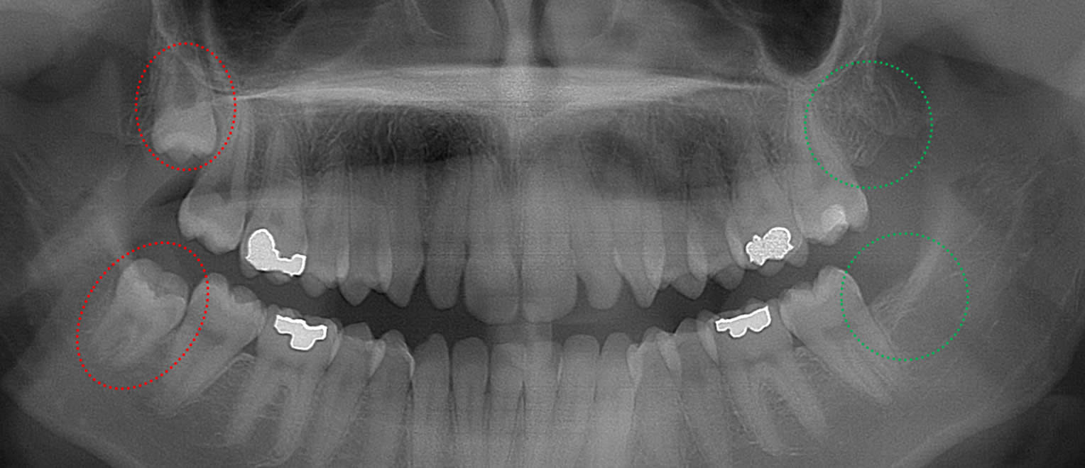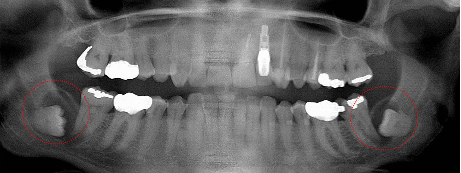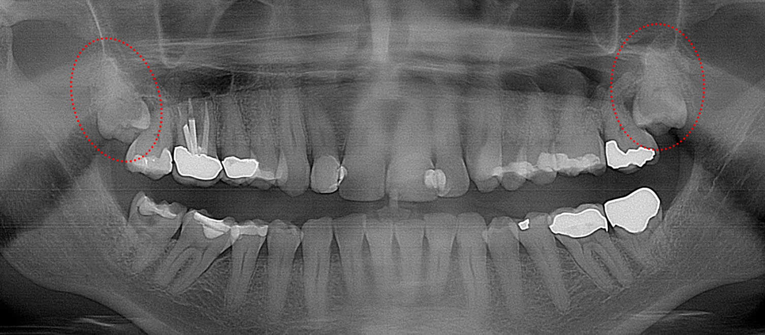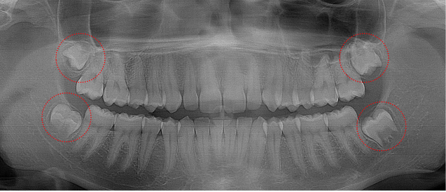 This 26 year old patient has all four 3rd molars present (circled). The upper right 3rd molar is badly decayed and the other three are partially erupted with signs of decay forming. Immediate extraction of all four is recommended.