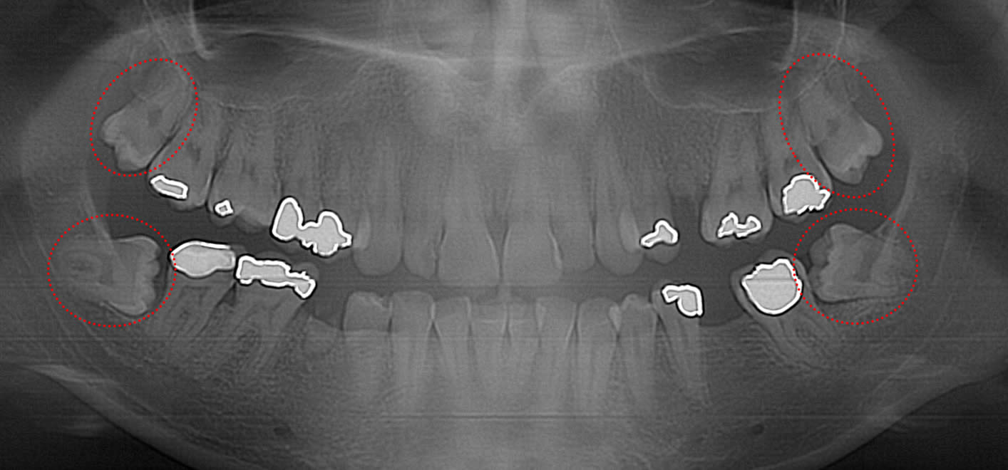 This 10 year old patient has four 3rd molar tooth buds present (circled) with three of them in the very early stages of enamel formation. The lower right 3rd molar tooth bud may have just a trace of enamel formed.
