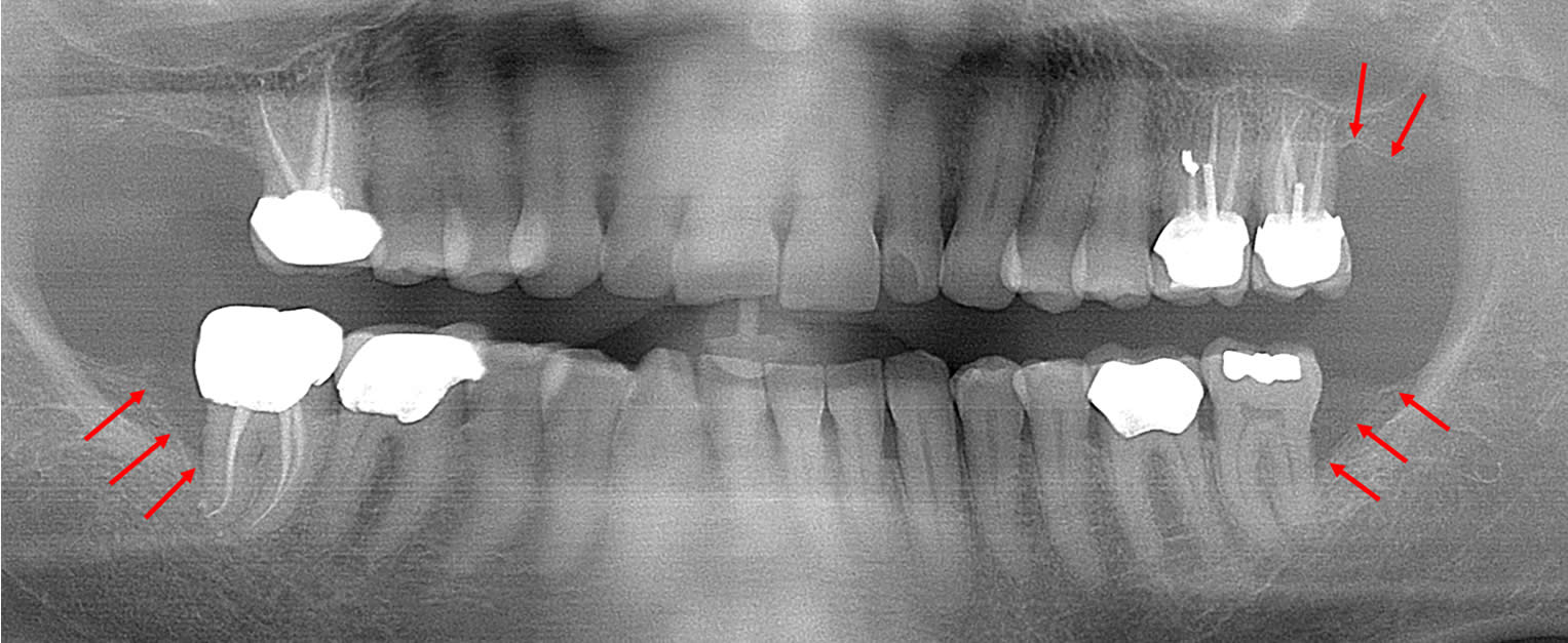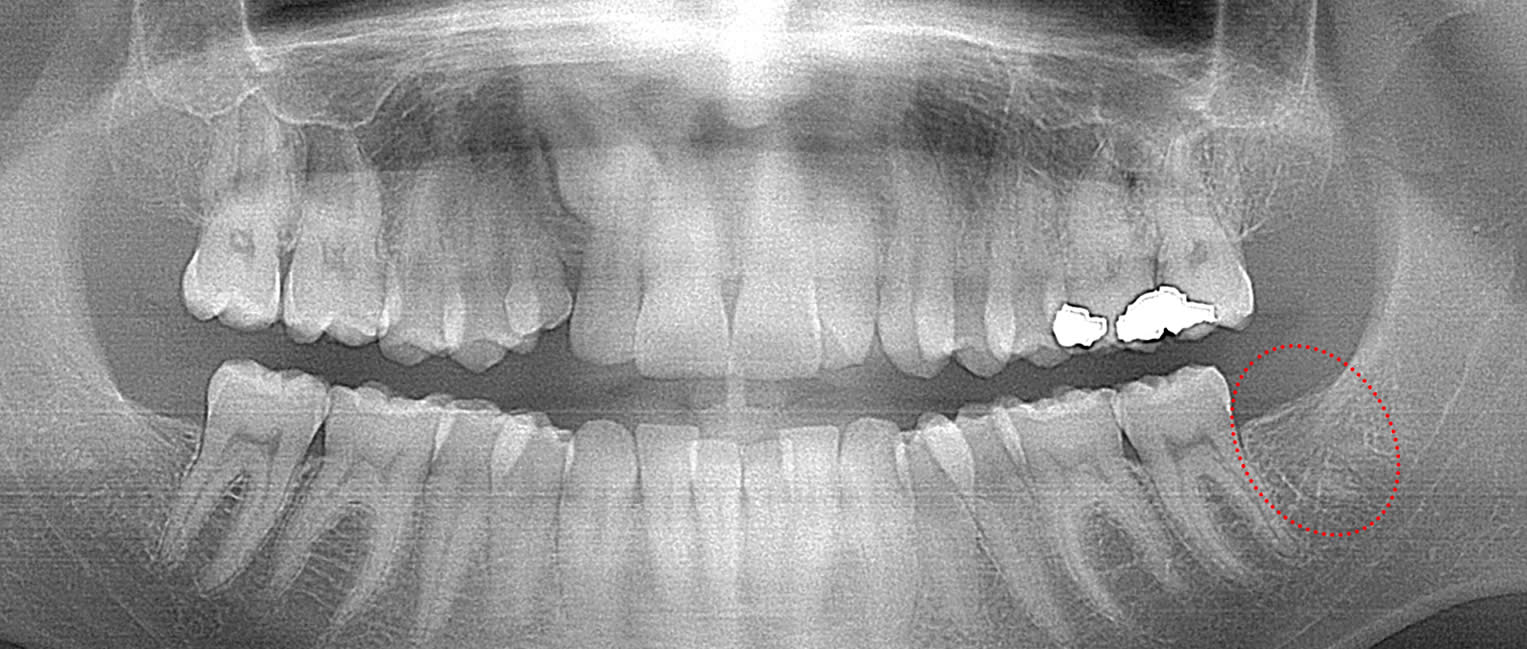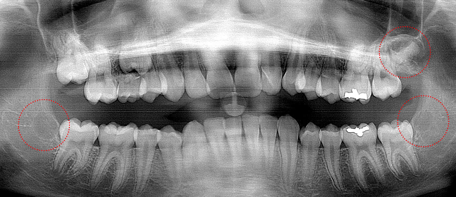 This 55 year old patient has bilateral mandibular 3rd molars present with cysts (circled) forming around them. Failure to have the 3rd molars and the expanding cysts removed will eventually lead to fractures in the mandible as the bone thins.