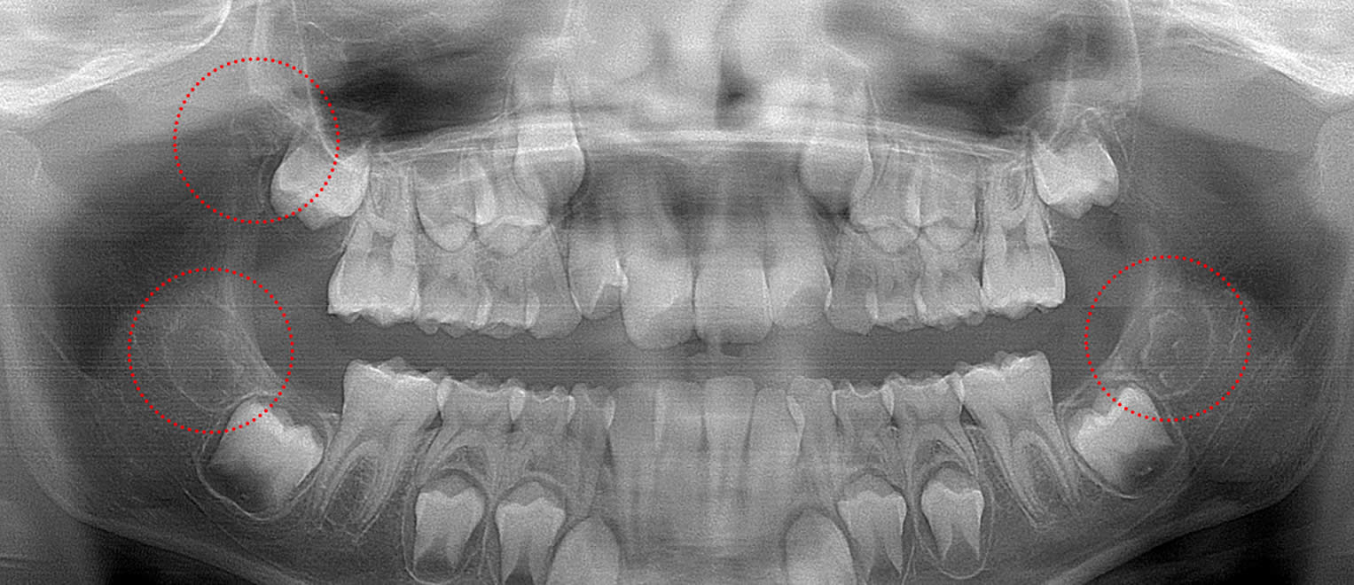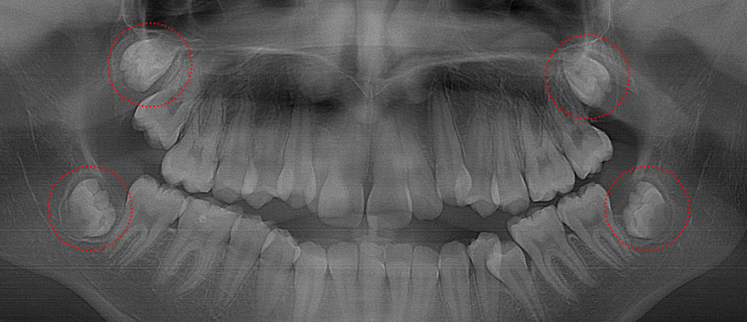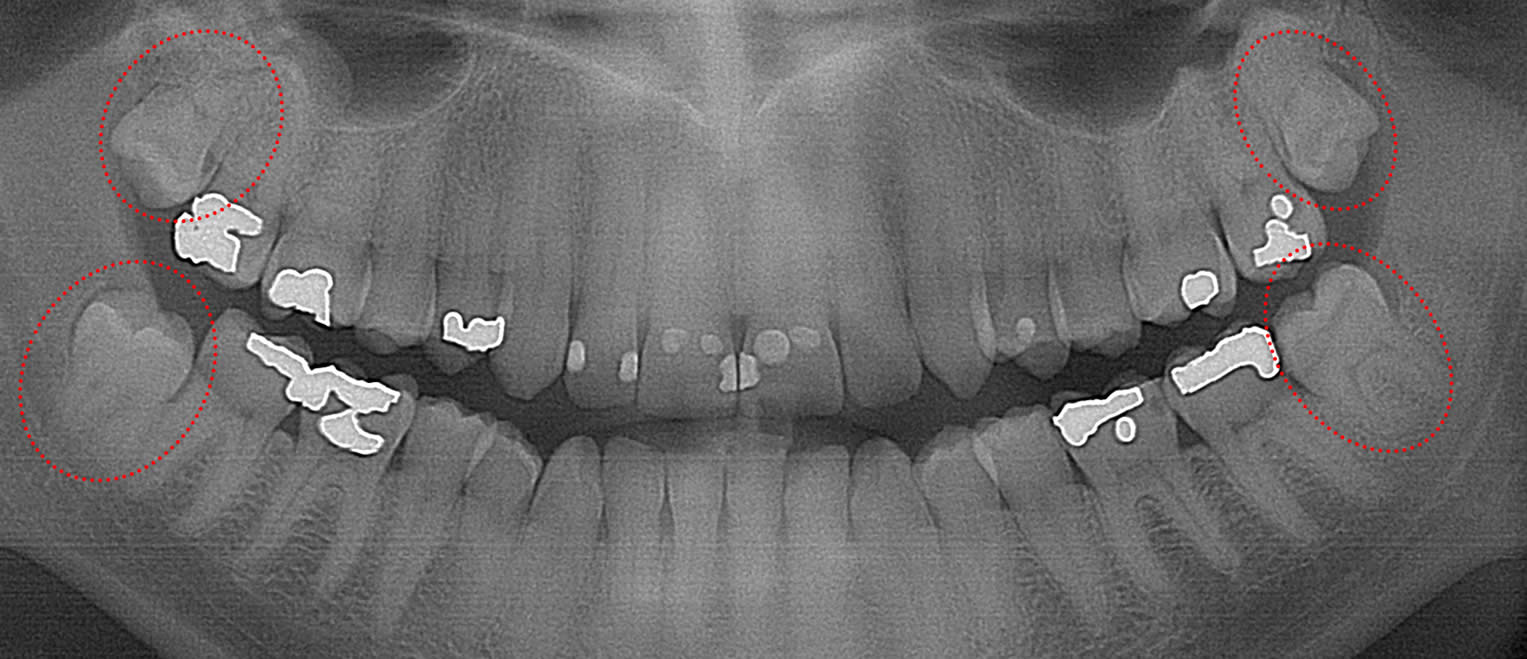This 15 year old patient has all four 3rd molars present (circled). Roots are approximately 1/3rd formed and they are oriented well with a good possibility of normal eruption 2-4 years from now. However, there is a high chance they will be soft-tissue impacted and decay as a result.