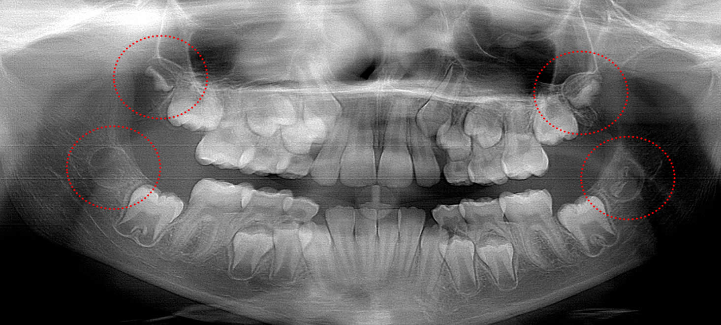 This 9-year old patient has three 3rd molars forming (circled). The cusp tips are barely detectable, indicating that enamel formation has just recently started. It is not certain that the upper left tooth bud will not form.